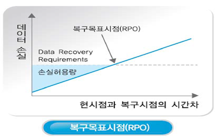 - RPO(Recovery Point Objective): "복구 시점 기준의 데이터 손실 허용 범위" 좀더 풀어서 설명해 보면 "재해로 인하여 중단된 서비스를 복구하였을 때, 유실을 감내할 수 있는 데이터의 손실 허용 시점"